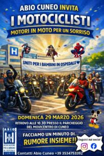 La sezione cuneese dell'Abio (Associazione per il bambino in ospedale) organizza, domenica 29 marzo, un flash mob dal titolo "I motociclisti - Motori in moto per un sorriso". Obiettivo dell'iniziativa è regalare un sorriso ai bambini ricoverati nella Pediatria dell'ospedale Santa Croce di Cuneo, facendo loro sentire la vicinanza della comunità attraverso la presenza di un nutrito gruppo di motociclisti che, in contemporanea, facciano rombare per un minuto i motori delle proprie motociclette. Alla manifestazione interverranno anche i Supereroi, già partner di Abio in molteplici occasioni.